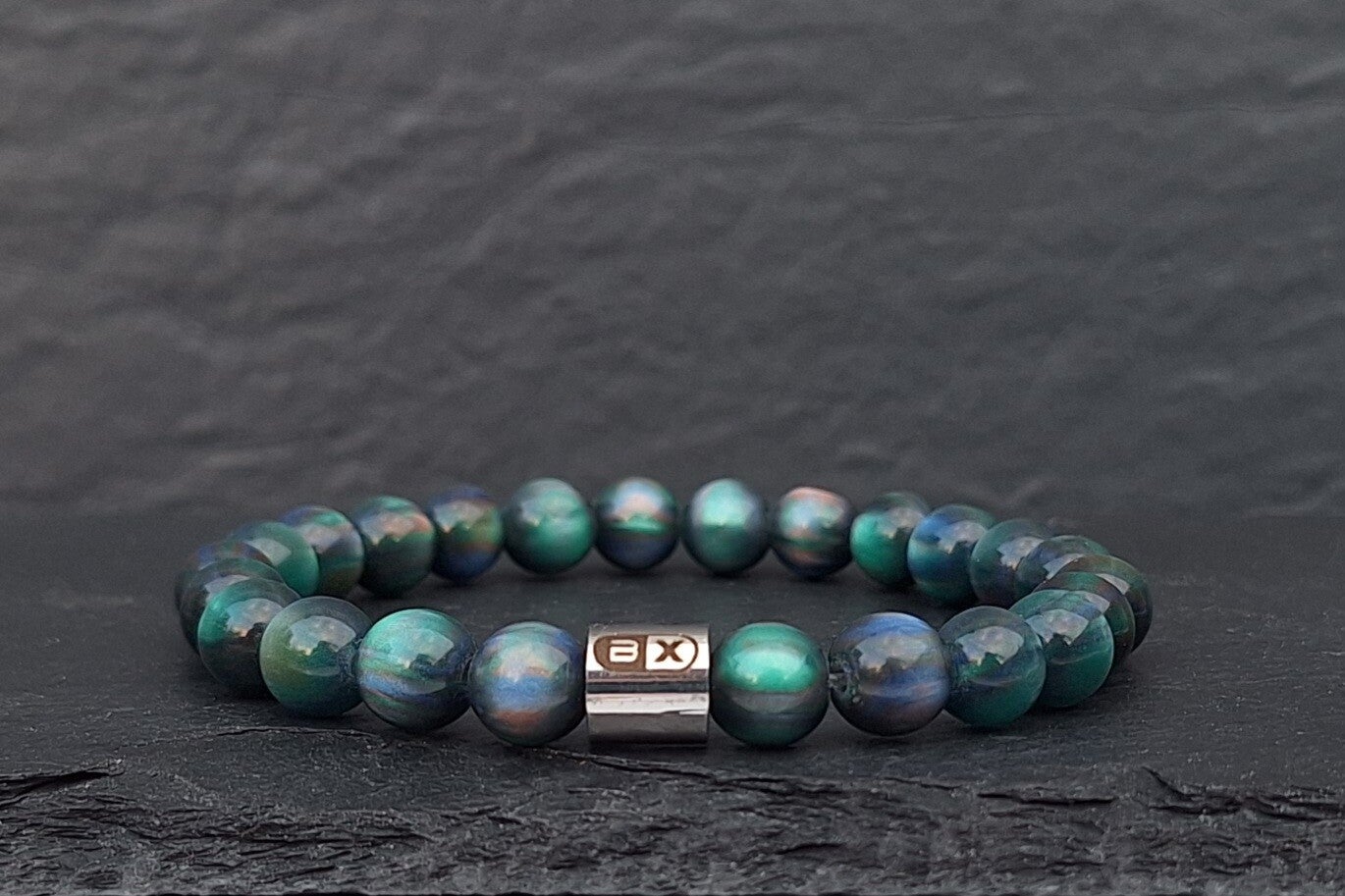 Deze handgemaakte armband combineert de natuurlijke schoonheid van Hars kralen met de kracht van roestvrij staal. De zorgvuldig geselecteerde ronde kralen geven de armband een unieke, levendige uitstraling, terwijl de RVS logokraal zorgt voor een stoere finishing touch.
