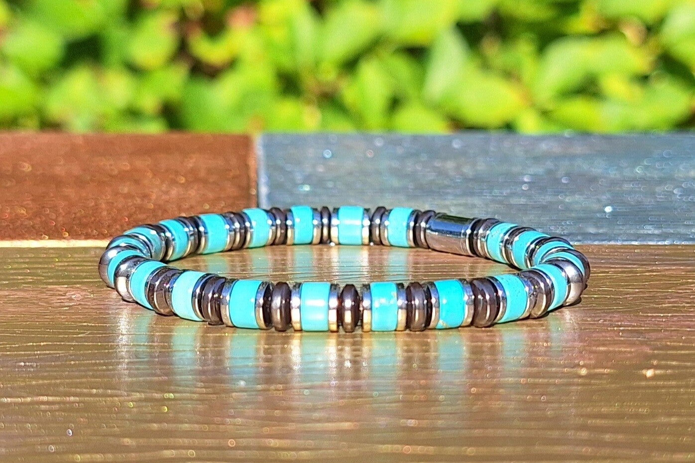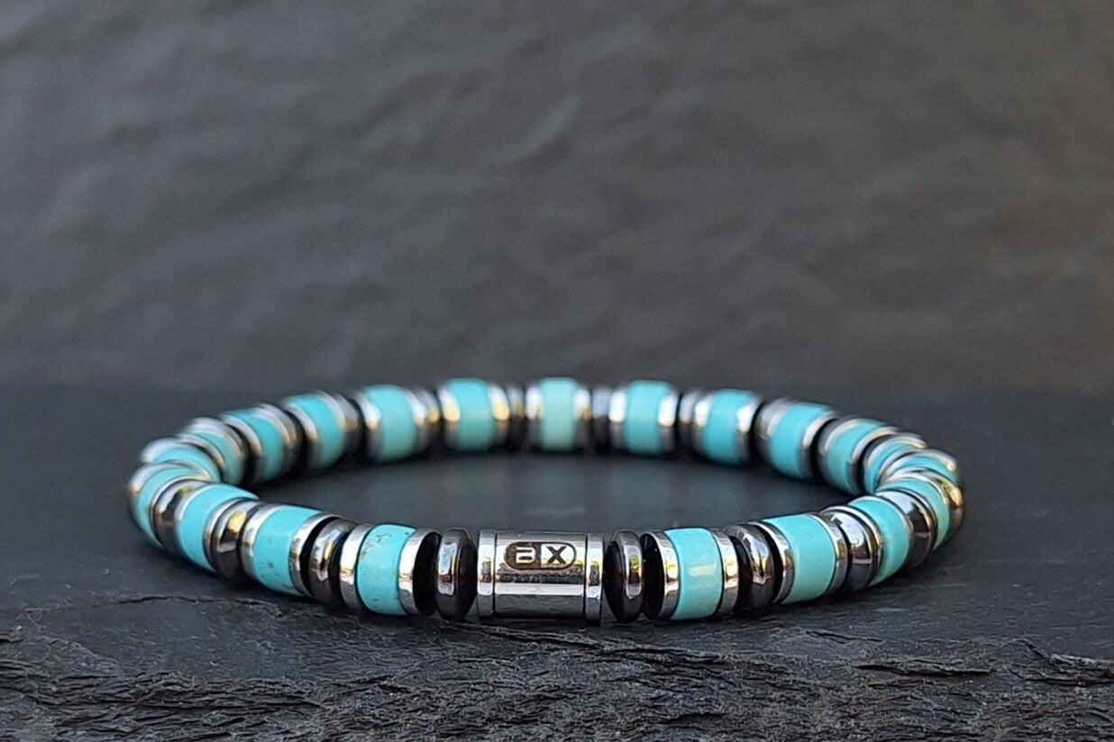 Deze unieke elastische natuursteen armband combineert de spirituele kracht van Turkoois met de aardende energie van Hematiet. Turkoois brengt innerlijke rust terwijl Hematiet stabiliteit brengt. De 6mm Turkoois rondelle kralen, afgewisseld met subtiele Hematiet accenten, creëren een stijlvolle en evenwichtig ontwerp.