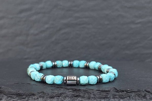 Deze unieke natuurstenen armband combineert een moderne, gefacetteerde kubusvorm met de tijdloze schoonheid van Turkoois. Turkoois staat voor heling en bescherming. De elastische pasvorm zorgt voor optimaal draagcomfort, geschikt voor zowel mannen als vrouwen. De subtiele Hematiet rondellen voegen een stoere touch toe, terwijl de roestvrijstalen logokraal het design compleet maakt. Deze handgemaakte armband is met zorg samengesteld uit hoogwaardige 5mm kralen en wordt geleverd in een luxe sieradendoosje – perfect als betekenisvol cadeau of als stijlvol accessoire voor je zelf!