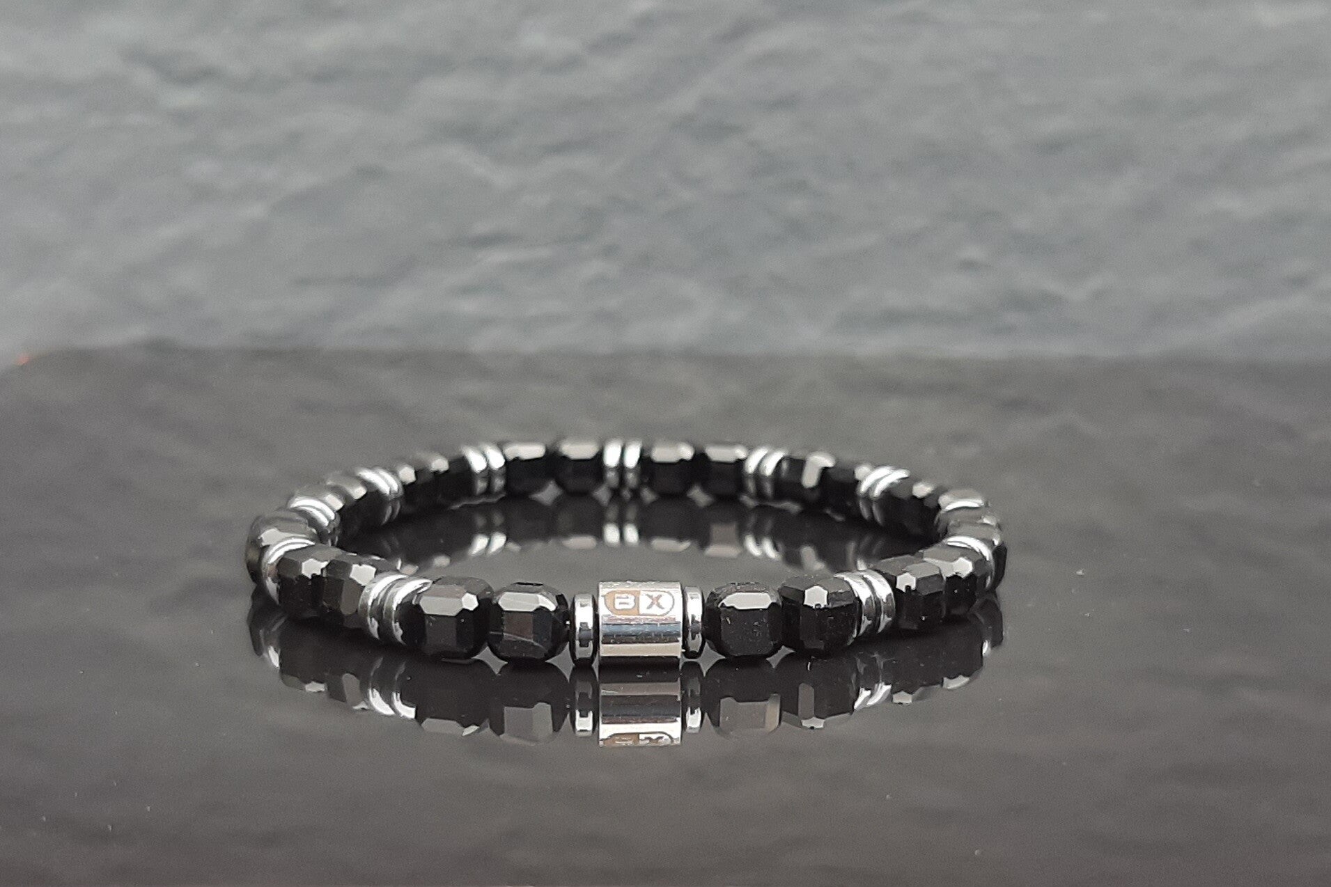 Deze unieke natuurstenen armband combineert een moderne, gefacetteerde kubusvorm met de tijdloze schoonheid van zwart Agaat. Agaat staat voor innerlijke balans en bescherming. De elastische pasvorm zorgt voor optimaal draagcomfort, geschikt voor zowel mannen als vrouwen. De subtiele Hematiet rondellen voegen een stoere touch toe, terwijl de roestvrijstalen logokraal het design compleet maakt. Deze handgemaakte armband is met zorg samengesteld uit hoogwaardige 5mm kralen en wordt geleverd in een luxe sieradendoosje – perfect als betekenisvol cadeau of als stijlvol accessoire voor je zelf!
