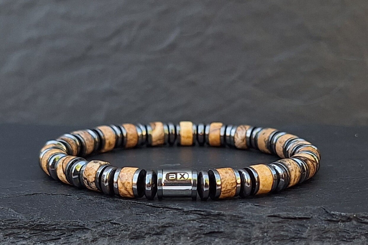 Deze unieke elastische natuursteen armband combineert de spirituele kracht van Landschap Jaspis met de aardende energie van Hematiet. Landschap Jaspis helpt bij zelfreflectie en brengt aarding terwijl Hematiet stabiliteit brengt. De 6mm Landschap Jaspis rondelle kralen, afgewisseld met subtiele Hematiet accenten, creëren een stijlvolle en evenwichtig ontwerp.