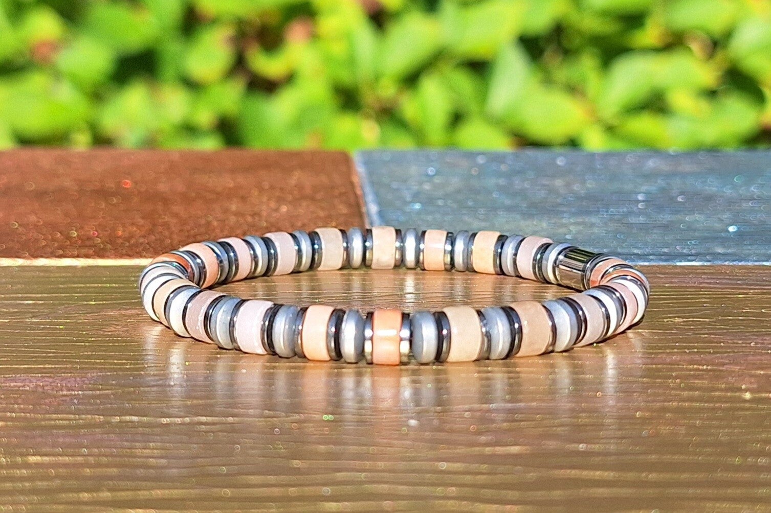Deze unieke elastische natuursteen armband combineert de spirituele kracht van Aventurijn, Opaal en Agaat met de aardende energie van Hematiet. Aventurijn trekt geluk en voorspoed aan terwijl Hematiet stabiliteit brengt. De 6mm Aventurijn, Opaal en Agaat rondelle kralen, afgewisseld met subtiele Hematiet accenten, creëren een stijlvolle en evenwichtig ontwerp.