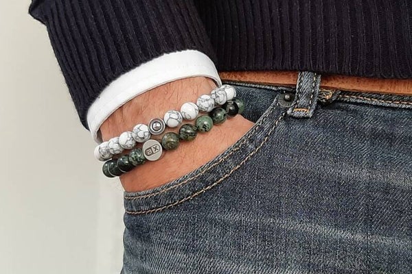 Beide armbanden zijn geregen op een elastische band, waardoor ze comfortabel passen om elke pols. Ze worden speciaal voor jou op maat gemaakt.