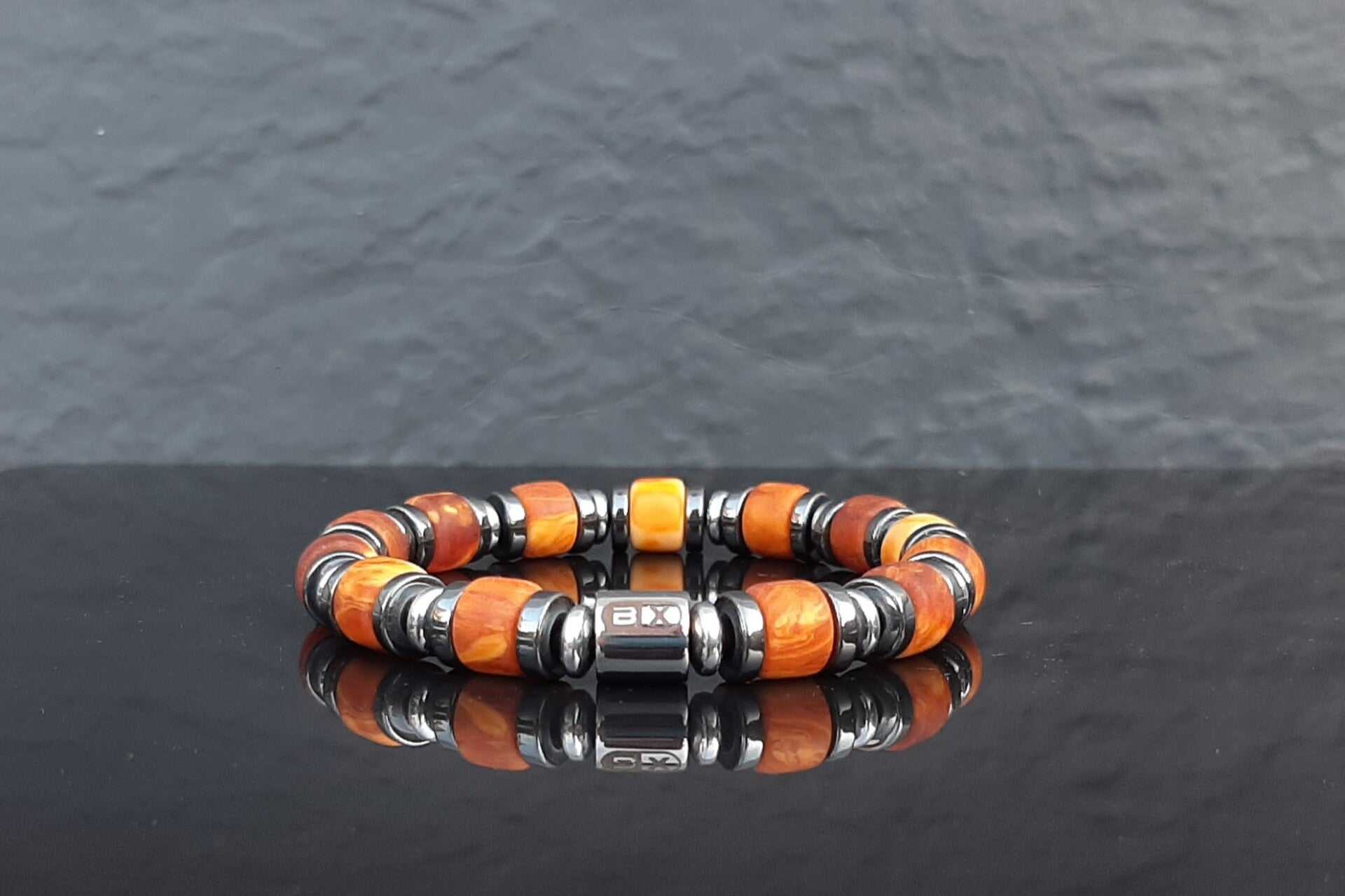 Deze handgemaakte armband is geregen op een elastische band en bestaat uit 8mm Amber rondelle kralen, elegant afgewisseld met Hematiet spacers. Hematiet staat bekend om zijn aarding en kracht. De zorgvuldig geselecteerde Amber kralen geven de armband een unieke, robuuste uitstraling, terwijl de RVS logokraal zorgt voor een stoere finishing touch.